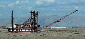 A bucket dredger is equipped with a bucket dredge, which is a device that picks up sediment by mechanical means, often with many circulating buckets attached to a wheel or chain.[18]
