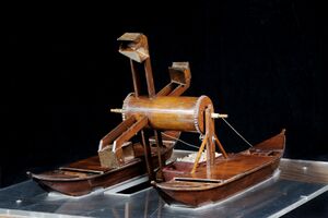 This is an early type of dredger which was formerly used in shallow water in the Netherlands. It was a flat-bottomed boat with spikes sticking out of its bottom. As tide current pulled the boat, the spikes scraped seabed material loose, and the tide current washed the material away, hopefully to deeper water. Krabbelaar is the Dutch word for "scratcher".[20]