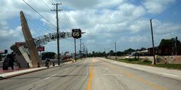 The skyline of Downtown Tulsa (2023) The Tulsa Historic Route 66 sign | |