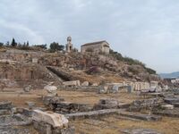 The Telesterion ("Initiation Hall" from Gr. τελείω, "to complete, to fulfill, to consecrate, to initiate") was a great hall and sanctuary in Eleusis, one of the primary centers of the Eleusinian Mysteries. The hall had a fifty-five yard square roof that could cover three-thousand people, but no one revealed what happened during these events beyond there being "something done, something said, and something shown".[1] This building was built in the 7th century BCE[2] and was an important site until it was destroyed in the 4th century CE. Devoted to Demeter and Persephone, these initiation ceremonies were the most sacred and ancient of all the religious rites celebrated in Greece.[3]
