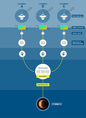 رسم توضيحي لآلية VLBI في EHT. كل هوائي، مفرود على مسافات شاسعة، لديه ساعة ذرية فائقة الدقة. الإشارات التماثلية التي تجمعها الهوائيات تـُحوَّل إلى إشارات رقمية وتـُخزَّن على أقراص صلبة ومعها إشارات الوقت المعطاة من الساعة الذرية. ثم تُشحن الأقراص الصلبة إلى موقع مركزي للتزامن. الصورة من المرصد الفلكي يتم الحصول عليها بمعالجة البيانات المجمّعة من مواقع متعددة.