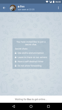 كما هو معروفٌ فلا يُمكن بدأ درشة سريّة إلّا بعد قبول الطرف الثاني دعوة يتم تبادل مفاتيح التشفير الخاصة بها للجلسة وتُتيح شبكة تيليجرام للمستخدمين في محادثة سرية التحقق من عدم حدوث أي هجوم في الوسط عن طريق مقارنة الصور التي تصور بصمات أصابع المفتاح العام الخاصة بهم.[85] جديرٌ بالذكر هنا أنّ تيليجرام قد بدأَ في دعمِ الدردشات السرية منذ كانون الثاني/ديسمبر 2014 وهو الآن يعملُ بشكلٍ دوريّ على تغيير مفاتيح التشفير بعد استخدامها لأكثر من 100 مرة أو بعدَ استخدامه لأكثر من أسبوع؛[63] في حين يتم تدمير مفاتيح التشفير القديمة.[50][51][86]
