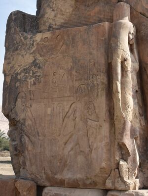 The twin statues depict Amenhotep III (fl. 14th century BC) in a seated position, his hands resting on his knees and his gaze facing eastwards (actually ESE in modern bearings) towards the river. Three shorter figures are carved into the front throne alongside his legs: these are his wife Tiye and mother Mutemwiya. The middle between Amenhotep III's ankles would have been an unidentified daughter, although it has been destroyed.[5] The side panels depict the Nile god Hapi.