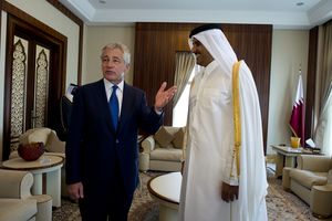 الشيخ تميم برفقة وزير الدفاع الأمريكي تشك هگل، 10 ديسمبر 2013.