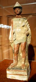 Anciently, Tanagra (باليونانية قديمة: Τάναγρα), sometimes written Tanagraea, was a town of ancient Boeotia, situated upon the left bank of the Asopus, in a fertile plain, at the distance of 130 stadia from Oropus and 200 from Plataeae.[3] Several ancient writers identified Tanagra with the Homeric Graea;[4] but others supposed them to be distinct places, and Aristotle regarded Oropus as the ancient Graea.[5][6][7] Pausanias mentions in Tanagra's location the ancient city of Graea, eponymous of the Graikoi, a Boeotian tribe whose name gave rise to the Latin Graecus "Greek". Homer, while reciting the Boeotian forces in the Iliad's Catalogue of Ships, provides the first known reference to the Boeotian city of Graea.[8]