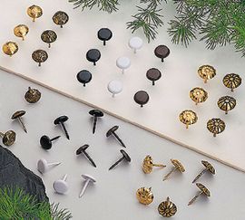 - ـ مسامير التنجيد: (الشكل 5) وهي مسامير من الحديد مسطحة الرؤوس بمقاسات مختلفة ولا تصلح إلا في التنجيد. وهناك كذلك مسامير خاصة ذات رؤوس مدببة جميلة المنظر تستعمل ظاهرة على السطح الخارجي للمشغولات للتثبيت النهائي بأشكـال هندسية مختلفـة وألوان تتناسب ولون القماش المستخدم.