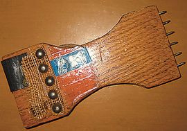 * ـ مشط الشد: (الشكل 9) وطوله 10 ـ15سم وهو من الخشب ومثبت عليه مسامير تغرس في السير في جوانب المشغولات بعد شدها، وغالباً ما يغلف بالجلد ليساعد العامل على مسكه في أثناء الشد.