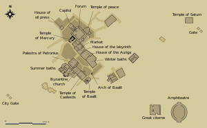 A 1916 excavation found a tetrastyle temple. The building was decorated with statues of Apollo, Venus, Silvanus, Bacchus, the Dioscuri, and a satyr. Three perfume vases showed dogs pursuing rabbits.[3]