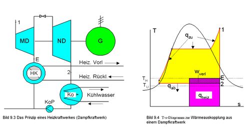 الفكرة الأساسية لطريقة عمل محطة تنتج الكهرباء والماء الساخن: MD توربين بخاري عالي الضغط //ND توربين يعمل بالضغط المنخفض // KoP مكثف ينتج ماءا عند 100 درجة مئوية ترسل إلى البيوت // G مولد كهربائي لتوليد التيار الكهربائي.