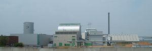 Masnedø CHP power station in Denmark. This station burns straw as fuel. The adjacent greenhouses are heated by district heating from the plant.