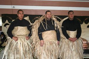 Tupoutoʻa-Lavaka (centre) in a mourning dress for his recently deceased father, king Tāufaʻāhau Tupou IV in 2006. He is flanked by his two sons, the new chiefs ʻUlukālala (left) and Ata (right)