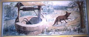 Peinture murale (1936) illustrant Le Renard et le Bouc.