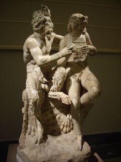 پان يعلّم دافنيس لعب المصفار syrinx. نسخة رومانية من أصل يوناني نحته هليودورس من رودس في القرن الثالث-الثاني ق.م. مجموعة فارنيزي، المتحف الأثري الوطني في ناپولي.