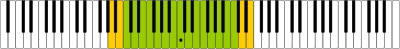 Tenor vocal range (C3–C5) notated on the treble staff (left) and on piano keyboard in green with dot marking middle C (C4). Note that the numeral eight below the treble clef indicates that the pitches sound an octave lower than written: see Clef#Octave clefs. This is the standard clef for tenor parts in scores.