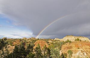 The brown, dormant grass dominates from late summer through the winter, but explodes into green color in the early summer along with hundreds of species of flowering plants. During winter, snow covers the sharp terrain of the badlands and locks the park into what Theodore Roosevelt called "an abode of iron desolation."[18]