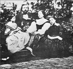 تيوفيل گوتييه، وزوجته إرنستينا گريسي-گوتييه وابنتيهما إستل وجوديت. الصورة مأخوذة حوالي 1857.