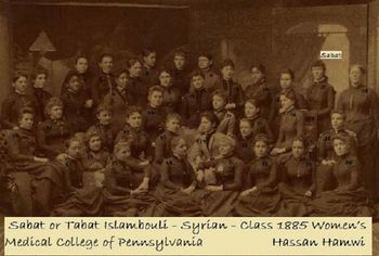 الدكتورة سبات الإسلامبولي، الدكتورة الإسلامبولي (الأولى من اليمين) طالبة دمشقية من حي اليهود ذهبت الى الولايات المتحدة الأميركية لدراسة الطب في جامعة بينسلفانيا، وعادت الى دمشق بداية القرن العشرين قبل السفر الى القاهرة للعمل هناك عام 1919. توفيت في مصر عام 1941. تظهر في هذه الصورة بلباس ريفي تقليدي، مع صديقاتها من اليابان والهند (ايضاً باللباس الفولكلوي) أول الطبيبات من الهند واليابان وسوريا، كطالبات في كلية الطب النسائي في ولاية بنسلفانيا في عام 1885. (الصورة: تراث مركز المحفوظات، دركسيل كلية الطب بجامعة) هناك صورة رائعة وهذا ما كان جعل جولات على شبكة الإنترنت مؤخرا، واشتعلت أعيننا. كنت قد رأيت النار: انها مجموعة من طالبات الطب وانهم جميعا النساء. واحدة من اليابان وهي واحدة من الهند، وثالثة من سوريا. انهم جميعا يرتدون الملابس التقليدية من بلدانهم الأصلية... شيء رائع جدا وذلك فى عام 1885. وكانت هؤلاء النساء طالبات في كلية الطب النسائي في ولاية بنسلفانيا والصورة التي توجد في محفوظات جامعة دريكسل وكانت هذه المرأة من الرائدات الطبيبات. كن ثلاثة تخرجن، كل واحدة منهم بذلك أصبحت أول امرأة من بلدانهم للحصول على شهادة البكالوريوس في الطب الغربي. معظم المعلومات المتاحة تتعلق بأبحاث امرأة من الهند، جوشي أنانديباي Joshee Anandibai كما تم استخدامها في هجاء قديمة من 1800s. لقد كانت براهمة امرأة عالية الطائفة الذين كان متزوجا من السن التاسعة إلى رجل كان يكبرها وعمره 20 عاما وأعرب عن ارتياحه رجل تقدمي جدا بالنسبة لعمره وبطريقة أبوية تقريباالتعليم زوجته. وهنا مقتطف من رسالتها للتطبيق لWMCP: