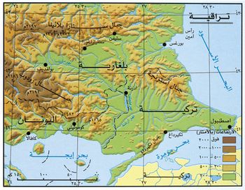 تراقية Thrace إقليم في أوربة يقع في أقصى جنوب شرقي شبه جزيرة البلقان، بين خطي العرض 41درجة و43درجة شمالاً، وخطي الطول 24 درجة و28 درجة و45 دقيقة شرقاً، مقسم سياسياً بين بلغارية وتركية واليونان منذ عام 1923. وتراقية محاطة من الشرق بالبحر الأسود ومضيق البسفور، ومن الجنوب ببحر مرمرة ومضيق الدردنيل وبحر إيجة، ومن الغرب جبال منطقة صوفية، ومن الشمال وادي نهر الدانوب، وقد تقلصت مساحة الإقليم في زمن الرومان بتراجع الحدود البرية في الغرب والشمال إلى قمم جبال صوفيا وجبال ستارا بلانينا، حيث انطبقت معها الحدود الإدارية على حدود الإقليم الجغرافي الذي تقدر مساحته اليوم بنحو 94,515 كم2 65.7٪ منها في بلغاريا و25٪ منها في تركيا، وتُعرف بتراقيا الشرقية، والباقي يدخل في أراضي اليونان الشمالية الشرقية، بإسم تراقيا الغربية.