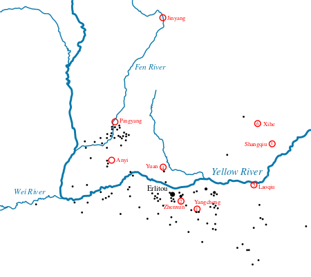 The Erlitou culture was an early Bronze Age urban society and archaeological culture that existed in the Yellow River valley from approximately 1900 to 1500 BC.[1][2] (A 2007 study of radiocarbon dating proposed a narrower date range of 1750 to 1530 BC.[3]) The culture was named after the site discovered at Erlitou in Yanshi, Henan. It was widely spread throughout Henan and Shanxi and later appeared in Shaanxi and Hubei. Most archaeologists consider Erlitou the first state-level society in China.[4] Chinese archaeologists generally identify the Erlitou culture as the site of the Xia dynasty, but there is no firm evidence, such as writing, to substantiate such a linkage,[5][6][7] as the earliest evidence of Chinese writing dates to the late Shang dynasty.
