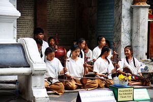 The music of Thailand can be categorized into two main genres: classical and popular. Thai classical music, also known as Phleng Thai-derm, is the most revered form of Thai music and is considered the pinnacle of the country's unique musical heritage.[60] With a history dating back centuries, classical music in Thailand is known for its intricate melodies and use of traditional instruments such as the ranat (xylophone), khong (gong), pi (oboe), saw (fiddle), khim (hammered dulcimer), chakhe (wooden percussion instrument), phin namtao (plucked string instrument), krachappi (percussion instrument), khaen (mouth organ), and khlui (flute), among others.[61] Its importance to Thai culture is reflected in its use in royal ceremonies, religious rituals, and other formal occasions.[61] In addition to ensemble genres such as piphat, khruang sai, and mahori,[61] Thai classical music includes a total of 981 categorized classical songs.[62]