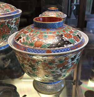 During the Ayutthaya period and beyond, Thai ceramic continued to develop and evolve. One type of porcelain that became especially prominent was Benjarong, originally produced in China with Thai-inspired designs. This intricately designed porcelain features five major colors, including black, red, white, yellow, and green. Over time, Thai artisans began producing Benjarong themselves, and it continued to be produced in Krung Thonburi and Rattanakosin, with a specific style called Lai nam thong incorporating gold leaf decoration that was mainly used by the aristocracy. Today, Thai ceramics continue to reflect the unique culture and way of life of Thailand, with more than 30 new colors and design styles that are unique to Thai ceramics.[42]