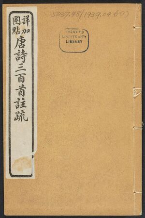 ثلاثمائة قصيدة من أسرة تانج هي أنطولوجيا of poems from the Chinese Tang dynasty (618–907). It was first compiled around 1763 by Sun Zhu (1722–1778[1]), who was a Qing Dynasty scholar and was also known as Hengtang Tuishi (蘅塘退士, "Retired Master of Hengtang"). Various later editions also exist. All editions contain slightly more than 300 total poems.[2] The number 300 (or more exactly 305) was a classic number for a poetry collection due to the influence of the Classic of Poetry (詩經, Shijing), which was generally known as The Three Hundred Poems.[1]