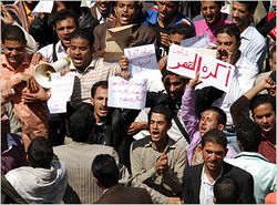 احتجاجات اليمن اندلعت بعد المراحل النهائية من الثورة التونسية 2010-2011 وبالتزامن مع الثورة المصرية 2011[14] في اطار مجموعة احتجاجات في العالم العربي بدأت في أوائل 2011. قامت الاحتجاجات بصفة أساسية ضد البطالة، الظروف الاقتصادية،[1]الفساد،[2] بالاضافة إلى قيام الحكومة بتغيير الدستور اليمني. كما طالب المحتجون الرئيس اليمني علي عبد الله صالح بالتنحي عن منصبه.