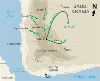 وكان أنور السادات يعتقد أن لواء مدعوم بالطائرات يمكنه تأمين السلال ومجموعة الضباط الأحرار اليمنيين.[22] ولكن تسارعت الأحداث وقامت السعودية - التي كانت تخشى المد الناصري - بإرسال قوات إلى الحدود اليمنية. وأرسل ملك الأردن رئيس أركان جيشه إلى الأمير حسن لإجراء مباحثات. وفي الأيام الممتدة بين 2 و 8 أكتوبر، غادرت أربع طائرات شحن سعودية محملة بالسلاح لإرساله إلى القبائل اليمنية الموالية للإمام. ولكن الطيارون اتجهوا إلى مدينة أسوان المصرية.[23] وقد أعلن سفراء ألمانيا، المملكة المتحدة، الولايات المتحدة، والأردن، دعمهم لنظام الإمام بينما أعلنت مصر، إيطاليا، وتشكوسلوفاكيا، دعمها للثورة الجمهورية.