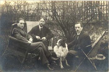 الأشقاء دوشان الثلاثة، من اليسار لليمين: مارسل دوشان وجاك ڤيون و ريمون دوشان-فيون في حديقة ستوديو جاك ڤيون، في پاتو، فرنسا، 1914, (مجموعات مؤسسة سميثسونيان.)