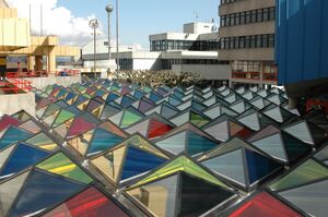 The following artworks have been constructed as part of Percent for art projects on university grounds: The glass roof (1972) consisting of 227 coloured pyramids in the main entrance area of the university, designed by Otto Piene; the pipe sculptures (1969–1974) by Friedrich Gräsel in the Hockgrabental; the gate structures (1984) by Georg Karl Pfahler; the spool sculpture (1972) by Gottfried Bechtold; and the wooden head sculptures (1993) by Stephan Balkenhols.