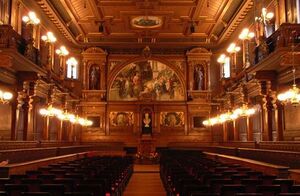 The so-called New University is regarded as the center of the Old Town Campus. It is situated at the Universitätsplatz (University Square) in the pedestrian zone, in direct vicinity to the University Library and to the main administration buildings. The New University was officially opened in 1931. Its erection was largely financed by donations of wealthy American families, in line with a fundraising campaign of Jacob Gould Schurman, an alumnus of Heidelberg University and former United States Ambassador to Germany.[47] It houses the new assembly hall, the largest lecture halls, and a number of smaller seminar rooms, mostly used by faculties of humanities and social sciences. Education in humanities and social sciences takes place to a great extent in buildings spread over the ancient part of town, though most are less than ten minutes walk from University Square. The faculties maintain their own extensive libraries and work spaces for students. Seminars and tutorials are usually held in the faculty buildings.[46]