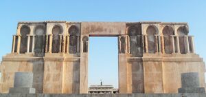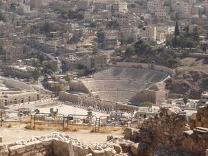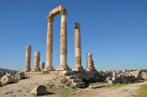 During the Umayyad period (AD 661–750), a palace structure, known in Arabic as al-Qasr (القصر), was built at the Citadel. The Umayyad Palace was probably used as an administrative building or the residence of an Umayyad official. The palace draws on Byzantine architectural patterns. For example, the entrance hall is built in the shape of a Greek cross. The palace may have been built on top of an existing Byzantine structure in this shape.[2] There is a huge water reservoir dug into the ground adjacent to the palace.