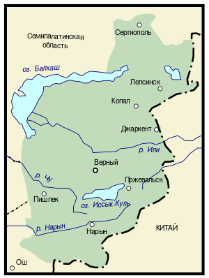 "Sedmorechie" today (in Russian), meaning "Seven rivers" (Kazakh- Zhetisu, Jetisuw, Jetysu)