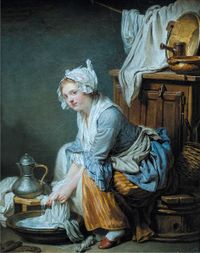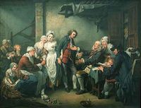 لقد كان جروز أشبه بشاردان صغير فيه مسحة من بوشيه، رجلاً معجباً حقيقة بالفضيلة وبحياة الطبقة الوسطى، ولكنه يكسوها بين الحين والحين إغراءً شهوانياً كان شاردان يتجنبه. وكان في استطاعة جروز إذا نسي أجساد نسائه أن ينشد في صورة أنشودة الحياة العائلية البرجوازية، كما نرى في "عروس القرية(67)" التي ظفرت بأكبر جائزة حين عرضت في آخر أسبوع لصالون 1761، وأصبحت حديث باريس. وأطرها ديدرو لما فيها من "عاطفة حلوة" وأشاد بها "مسرح الإيطاليين" إشادة لم يسبق لها نظير، إذ قدمها في "لوحة حية" على المسرح. وقد وجد الخبراء فيها عيوباً-من ضوء لم يحسن المصور التصرف فيه، إلى ألوان متنافرة، إلى قصور في الرسم والتنفيذ، وضحك الأرستقراطيون على ما فيها من غلو في العاطفة، ولكن جمهور باريس، الذي كان قد عب في الزنا حتى الثمالة، وأبكته في هذه السنة بعينها "جولي" روسو، كان في مزاج يدعوه لاحترام النصائح والتحذيرات الخلقية التي كادت تسمع من فم والد العروس إلى زوجها الموعود. وكانت كل عقيلة من عقائل الطبقة الوسطى عليمة بمشاعر تلك الأم وهي تسلم ابنتها لمشاق الزواج ومخاطره، وكل فلاح كان يشعر بأنه ليس غريباً في ذلك الكوخ الذي تنقر فيه دجاجة وأفراخها الغلة على أرضه أو تشرب في اطمئنان من القدر التي تحت قدم الأب. وأشترى مركيز دمارينيه الصورة لفوره، ودفع الملك فيها بعد ذلك 16.650 جنيهاً ليحول دون بيعها بالخارج. وهي اليوم محفوظة بإحدى حجرات اللوفر التي لا تحظى بزوار كثيرين، وقد أتلفها تغير ألوانها السطحية جداً، وغض الجمهور من قدرها في غمرة تمرد الواقعية والكلبة على العاطفة المتفائلة.