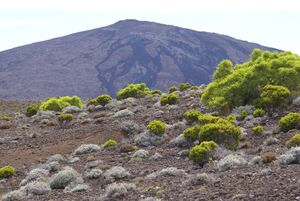 Subalpine shrub occurs on the volcanoes on Réunion, above the treeline at 1800 to 2000 metres elevation. Average annual rainfall is from 2000 to 6000 mm, and frosts occur regularly in winter. Characteristic shrubs include Erica reunionensis and Erica galioides (Ericaceae), Stoebe passerinoides and species of Hubertia and Psiadia (Asteraceae), and Phylica nitida (Rhamnaceae). Herbaceous endemic species include Heterochaenia rivalsii (Campanulaceae), Eriotrix commersonii (Asteraceae), and Cynoglossum borbonicum (Boraginaceae).[11]