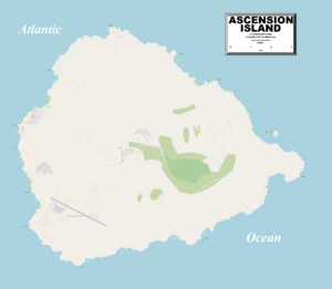 جزيرة أسنشن هي جزيرة بركانية منعزلة، 7°56′ south of the Equator in the South Atlantic Ocean. It is about 960 ميل (1،540 km) from the coast of Africa and 1،400 ميل (2،300 km) from the coast of South America. It is governed as part of the British Overseas Territory of Saint Helena, Ascension and Tristan da Cunha,[4] of which the main island, Saint Helena, is around 800 ميل (1،300 km) to the southeast. The territory also includes the sparsely populated Tristan da Cunha archipelago, 2،000 ميل (3،200 km) to the south, about halfway to the Antarctic Circle.