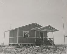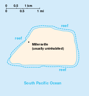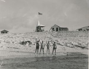 Jarvis Island was reclaimed by the United States government and colonized from March 26, 1935, onwards, under the American Equatorial Islands Colonization Project. President Franklin D. Roosevelt assigned administration of the island to the U.S. Department of the Interior on May 13, 1936.[2] Starting out as a cluster of large, open tents pitched next to the still-standing white wooden day beacon, the Millersville settlement on the island's western shore was named after a bureaucrat with the United States Department of Air Commerce. The settlement grew into a group of shacks built mostly with wreckage from the Amaranth (lumber from which was also used by the young Hawaiian colonists to build surfboards), but later, stone and wood dwellings were built and equipped with refrigeration, radio equipment, and a weather station.[28] A crude aircraft landing area was cleared on the northeast side of the island, and a T-shaped marker which was intended to be seen from the air was made from gathered stones, but no airplane is known to have ever landed there. According to the 1940 U.S. Census, Jarvis Island had a population of three people.[29]