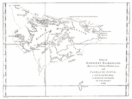 - ^ أ ب J. MacBride. A chart of Hawkins’s Maidenland, discovered by Sr. Richard Hawkins in 1574 and Falkland Sound, so called by Capn. John Strong of the Farewell from London who sailed through it in 1689. Scale 1:1000000. In: An account of the voyages undertaken by the order of His present Majesty for making discoveries in the Southern Hemisphere. Eds. J. Hawkesworth and J. Byron. Vol. I. London: W. Strahan and T. Cadell, 1773 (following p. 40)
