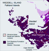 - ^ أ ب ت D.T. Aldiss and E.J. Edwards. The Geology of the Falkland Islands. British Geological Survey Technical Report WC/99110, 1999. pp. 98–103