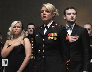 Timberlake with Marine Cpl. Kelsey De Santis at the Instructor Battalion Marine Corps Ball in November 2011. Timberlake attended as De Santis' date after she issued an invitation via YouTube.