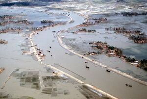 Natural hazards: Much of the country is submerged by floodwater in the monsoon season (and traditional settlements and agriculture are adapted to this); damaging floods occur when rivers rise higher than normal; tropical cyclones (hurricanes) and storm surges; droughts; riverbank erosion along the country's major rivers and in the Meghna estuary; earthquakes; possibly tsunamis.[23]