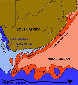 The courses of the warm Agulhas current (red) along the east coast of South Africa, and the cold Benguela current (blue) along the west coast. Note that the Benguela current does not originate from Antarctic waters in the South Atlantic Ocean, but from upwelling of water from the cold depths of the Atlantic Ocean against the west coast of the continent. The two currents do not "meet" anywhere along the south coast of Africa.