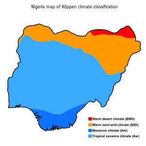 تتواجد نيجريا في المنطقة الإستوائية، حيث المناخ الرطب وشديد الرطوبة موسومياً. تتأثر نيجريا بأربع أنواع من المناخ؛ يمكن تمييز هذه الأنواع من المناخ، بالانتقال من الجزء الجنوبي من نيجريا إلى الجزء الشمالي منها عبر الحزام الأوسط.