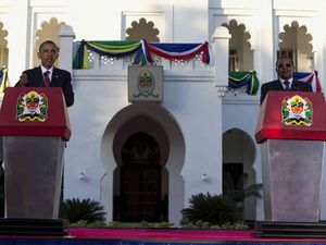 الرئيس الأمريكي باراك اوباما والرئيس التنزاني جكايا كيكوته في حديث صحفي أثناء زيارة الأول لدار السلام في يونيو 2013.