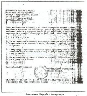 الأمر بإخلاء المواطنين ذوي العرقية الصربية من أراضي RSK، التي أصدرتها وزارة الدفاع الصربية ووقعها ميلان مارتيتش؛ 4 أغسطس 1995.
