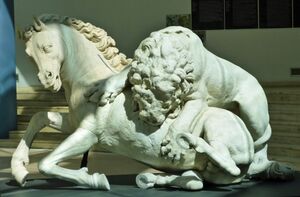 An anecdote regarding the origin of the subject matter emerged soon after the artist death, originally published in The Sporting Magazine in 1808, and reiterate often for well over a century and a half. Art historian H. W. Janson repeated it "On a visit to North Africa, he had seen a horse killed by a lion; this experience haunted his imagination, and from it he developed a new type of animal picture full of Romantic feeling for the grandeur and violence of nature."[3] However, research published in 1965 produced a rather persuasive argument that Stubbs in fact never traveled to Africa, and the actual inspiration for the painting was an antique sculpture he had seen in a well documented 1754 stay in Rome. The sculpture, Lion Seizing a Horse, in the Palazzo dei Conservatori, Rome, is a restored Roman copy of a Hellenistic original. It has been a celebrated work since the Renaissance, admired by Michelangelo, included in guidebooks of Stubbs's day, and copied any number of times by various artist in marble, bronze, and prints, including an 18th-century marble copy in the collection of Stubbs's patron Henry Blundell, who also acquired one of the paintings by Stubbs.[1][2]