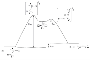 A theory, for an E2 reaction, by Joseph Bunnett suggests the lowest pass through the energy barrier between reactants and products is gained by an adjustment between the degrees of Cβ-H and Cα-X rupture at the transition state. The adjustment involves much breaking of the bond more easily broken, and a small amount of breaking of the bond which requires more energy.[23] This conclusion by Bunnett is a contradiction from the Hammond postulate. The Hammond postulate is the opposite of what Bunnett theorized. In the transition state of a bond breaking step it involves little breaking when the bond is easily broken and much breaking when it is difficult to break.[23] Despite these differences, the two postulates are not in conflict since they are concerned with different sorts of processes. Hammond focuses on reaction steps where one bond is made or broken, or the breaking of two or more bonds occur simultaneously. The E2 theory transition state concerns a process when bond formation or breaking are not simultaneous.[23]