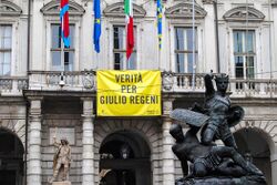 لافتة "الحقيقة من أجل جوليو ريجيني"، بتاريخ 4 أبريل 2016 على واجهة قصر المدينة، بتورينو، إيطاليا.