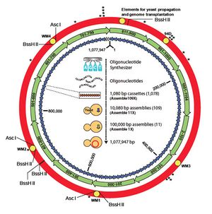 الخميرة جعلت الإرتباط أولا لأقصر القصاصات (ما يزيد قليلا على۱۰۰۰ من أزواج القاعدة الأساسية لكل منهما) معا في مسارات أطول ل ۱۰,۰۰۰ زوج قاعدة. وتتم إزالة المسارات الأطول ، إضافة أخرى في مجموعات من عشرة ، وتوضع مرة أخرى في الخميرة لربط فروع ۱۰۰,۰۰۰ زوج قاعدة. وبعد ثلاث جولات من هذا ، كان الفريق قد انتج الجينوم الكامل ، وتمتد لأكثر من مليون من الأزواج الأساسية. لتميز الجينوم الاصطناعي الناتج من تلك الموجودة في الطبيعة ، و هذا يعد "علامة مائية" خاصة تسلسل اضيف الى الحمض النووي بحيث لا يكون مخطئا لأحد الأنواع الموجودة في الطبيعية.