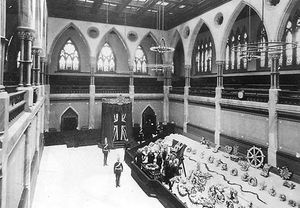 Part of the National Policy was implemented in the budget presented in February 1879. Under that budget, Canada became a high-tariff nation like the United States and Germany. The tariffs were designed to protect and build Canadian industry—finished textiles received a tariff of 34%, but the machinery to make them entered Canada free.[9] Macdonald continued to fight for higher tariffs for the remainder of his life.[10]